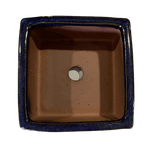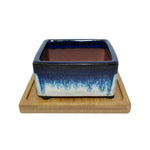 4" Cobalt Blue Over Cream Square Ceramic Succulent Pot With Decorative Bamboo Saucer
