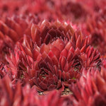 SEMPERVIVUM 'Coral Red' PPAF. 4" tall, 6" spread, full sun. Unique red foliage contrasts dramatically with the typical greens and pinks of other Hen & Chicks. Has a very strong root system and branches well. Surround it with white stones for a modern twist. Drought & heat tolerant. Deer & rabbit resistant. Zones 4-9. Potted in 3" pot.