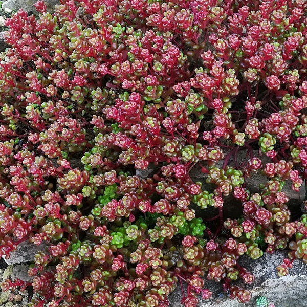 SEDUM o. 'Red Wiggle'. 3-4" tall, 10-12" spread, full sun, late summer bloom. Needle-like foliage starts green when young and turns red as it ages, giving the plant a bicolor appearance. Foliage transforms to solid red in the fall. Yellow flowers may appear occasionally. Requires little water once established. Attracts butterflies & is bee friendly. Rabbit resistant. Zones 4-9. Potted in 3" pot.