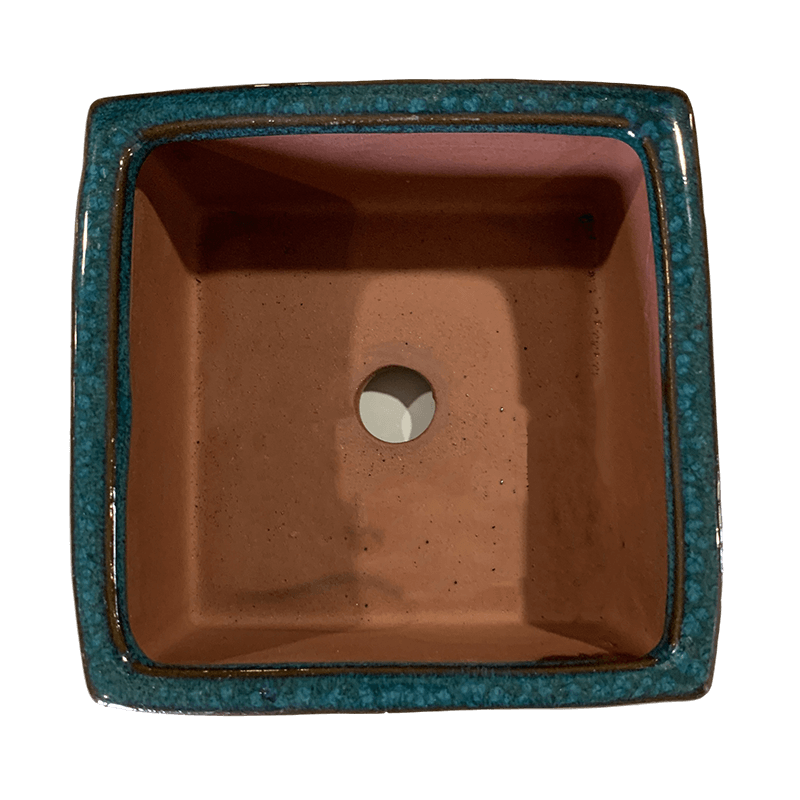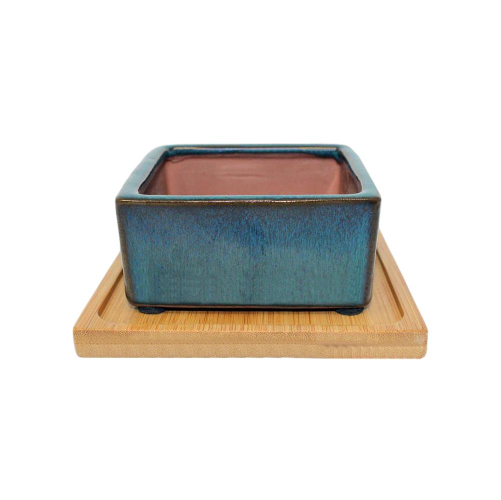 4" Teal Jade Square Ceramic Succulent Pot With Decorative Bamboo Saucer