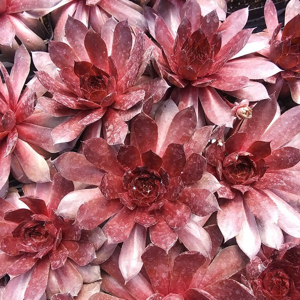 Perennial Peggy Hen & Chicks - SEMPERVIVUM 'Peggy'. 4-6" tall, 6-8" spread, full sun. In spring, leaves are purple, transitioning to deep red in summer. Fall and winter colors are more subdued, ranging from mahogany to brown. No matter the season, it provides a unique dark contrast for gardens or containers. Drought & heat tolerant. Deer and rabbit resistant. Zones 3-8. Potted in 3" pots.