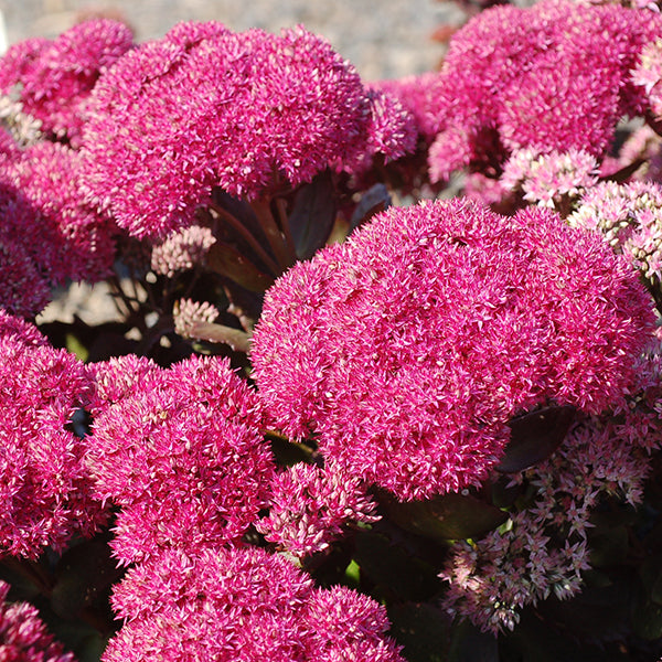 SEDUM 'Birthday Party' PP22826 - Party Hardy™ Series. 7" tall, 20" spread, full sun, late summer-eary fall bloom. The glossy green foliage with burgundy-red edges, deepens as the season progresses. 5" wide, deep pink rose flowers bloom high above the short foliage. Low maintenance. Attracts butterflies, hummingbirds & is bee friendly. Deer resistant. Zones 4-9. Potted in 3" pot.