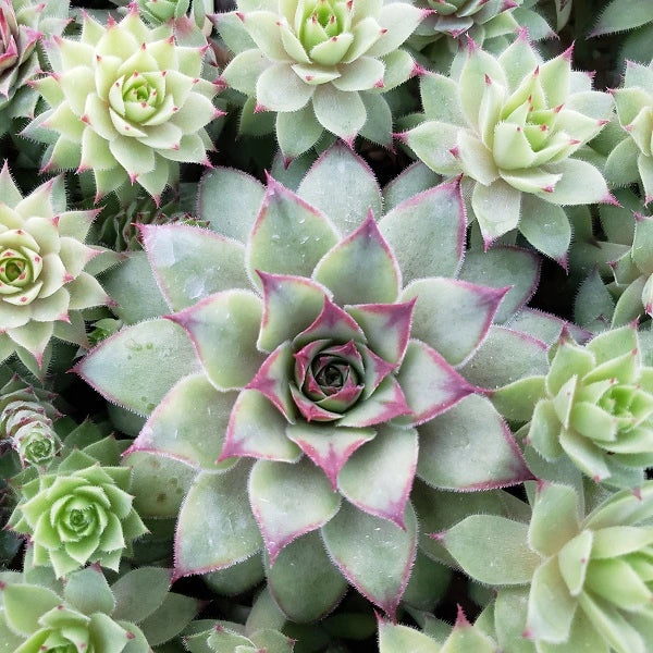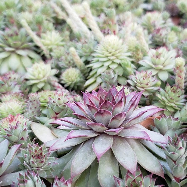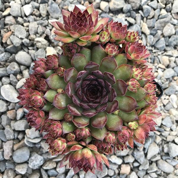 SEMPERVIVUM 'Bronco'. 3" tall, 8" spread, full sun. Most often seen as green with purple tips. Distinct burgundy-red watermarks are striking in winter. Drought & heat tolerant. Deer & rabbit resistant. Zones 5-10. Potted in 3" pot.