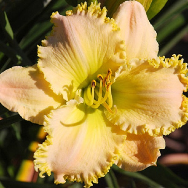 (Klehm) T 32" M D Re F 5 ''bloom. Soft peach-cream blend self with yellow ruffled and toothed edging. Faint white midrib. A stunning rebloomer! Full Sun. Attracts butterflies and is bee friendly. Zones 3-9. 2/3 fan division, bareroot.