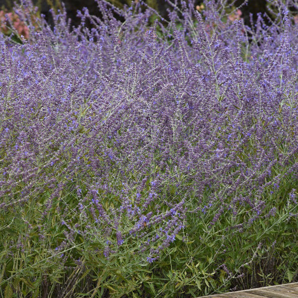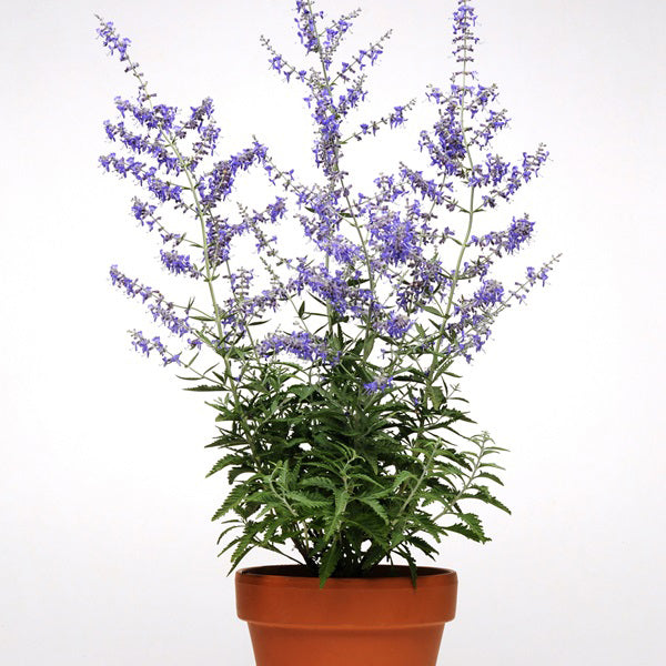 PEROVSKIA a. 'CrazyBlue' PP25639. 16-18" tall, 14-16" spread, full sun, late spring-late summer bloom. Violet-blue flower spikes rise above the compact mound of lacy, gray-green foliage. Branches are sturdy and do fall open in wind and rain. Drought and heat tolerant once established. Long blooming! Attracts hummingbirds & is bee friendly. Deer & rabbit resistant. Zones 4-9. Potted in 3" pot.