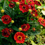 HELENIUM a. 'Salsa' - Mariachi™ Series. PP25978. 18-20" tall, 18-24" spread, full sun, mid summer-early fall bloom. Vibrant salsa-red petals that encircle a dark maroon cone with a bright yellow collar. Its sturdy, straight stems make it an excellent choice for cut flowers. Long-blooming and compact. Exhibits excellent powdery mildew resistance. Attracts butterflies, birds & is bee friendly. Deer resistant. Zones 3-9. Potted in 3" pot.