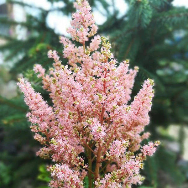 ASTILBE j. 'Peach Blossom'. 24" tall, 15-18" spread, part sun-full shade, early summer bloom. Delicate peach plumes are dense with a hint of pink. Plumes are full and lend a frothy appearance to the clump. Glossy, green foliage. Bee friendly. Deer & rabbit resistant. Zones 4-9. 2-3 eye, bareroot division.