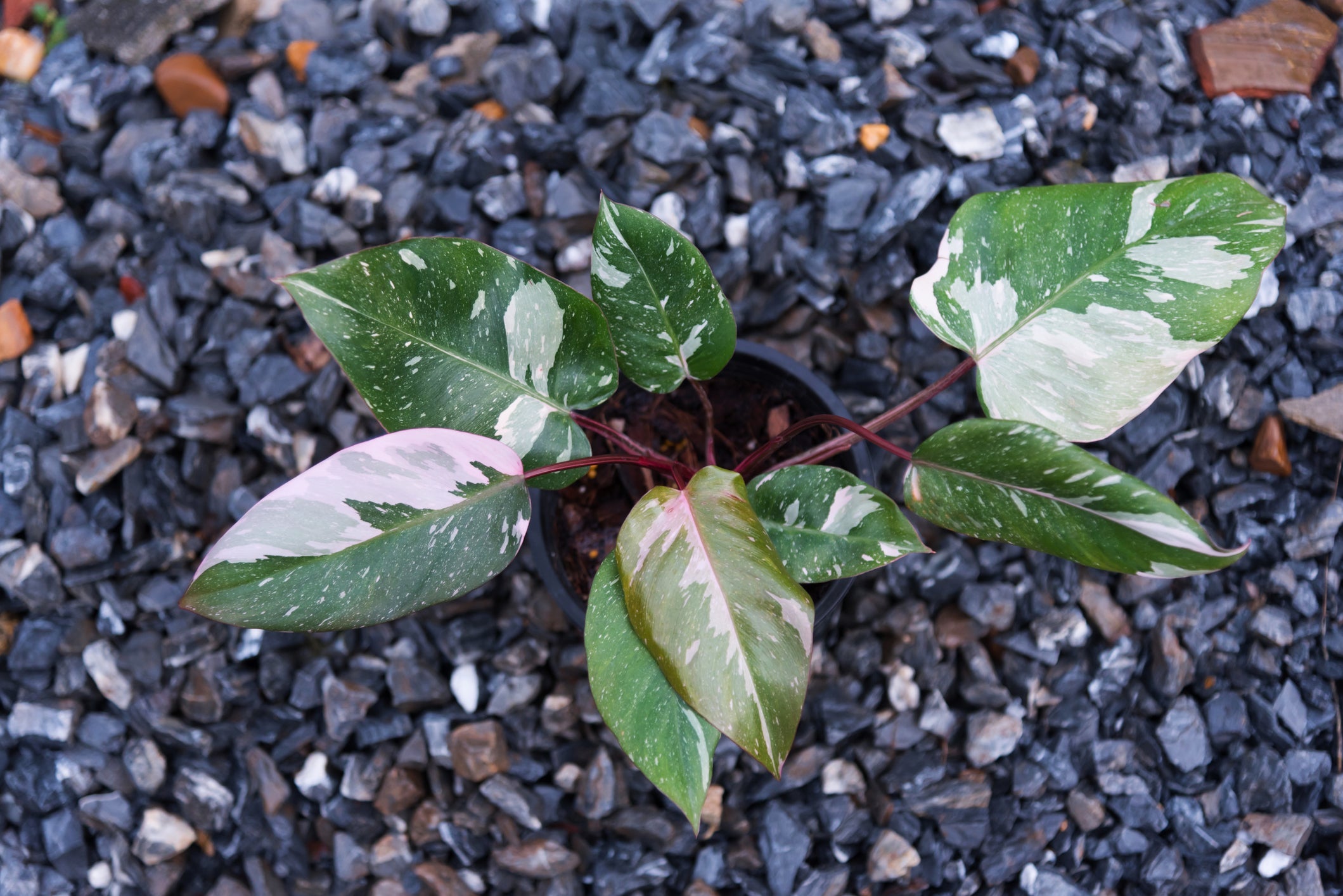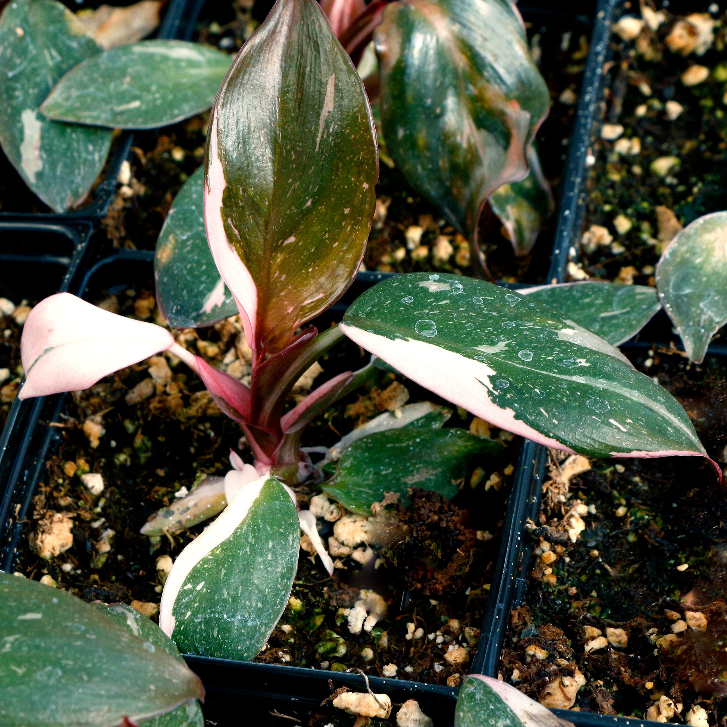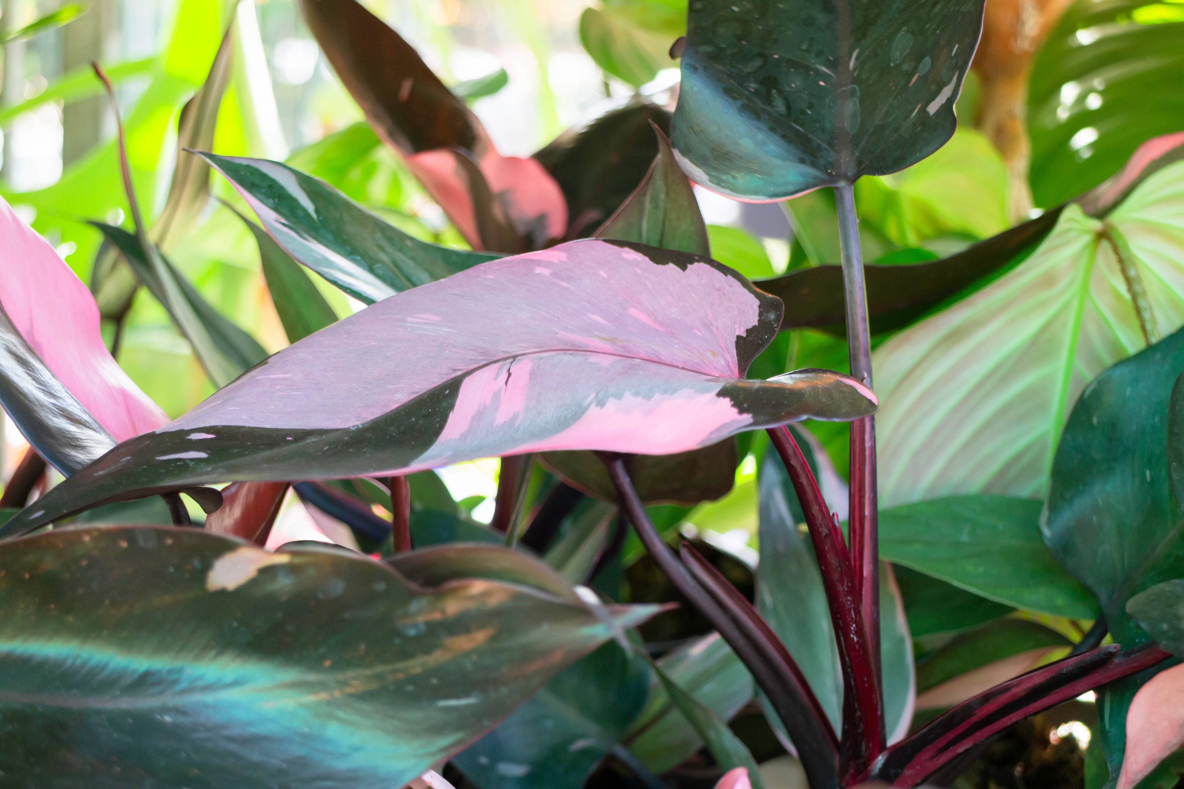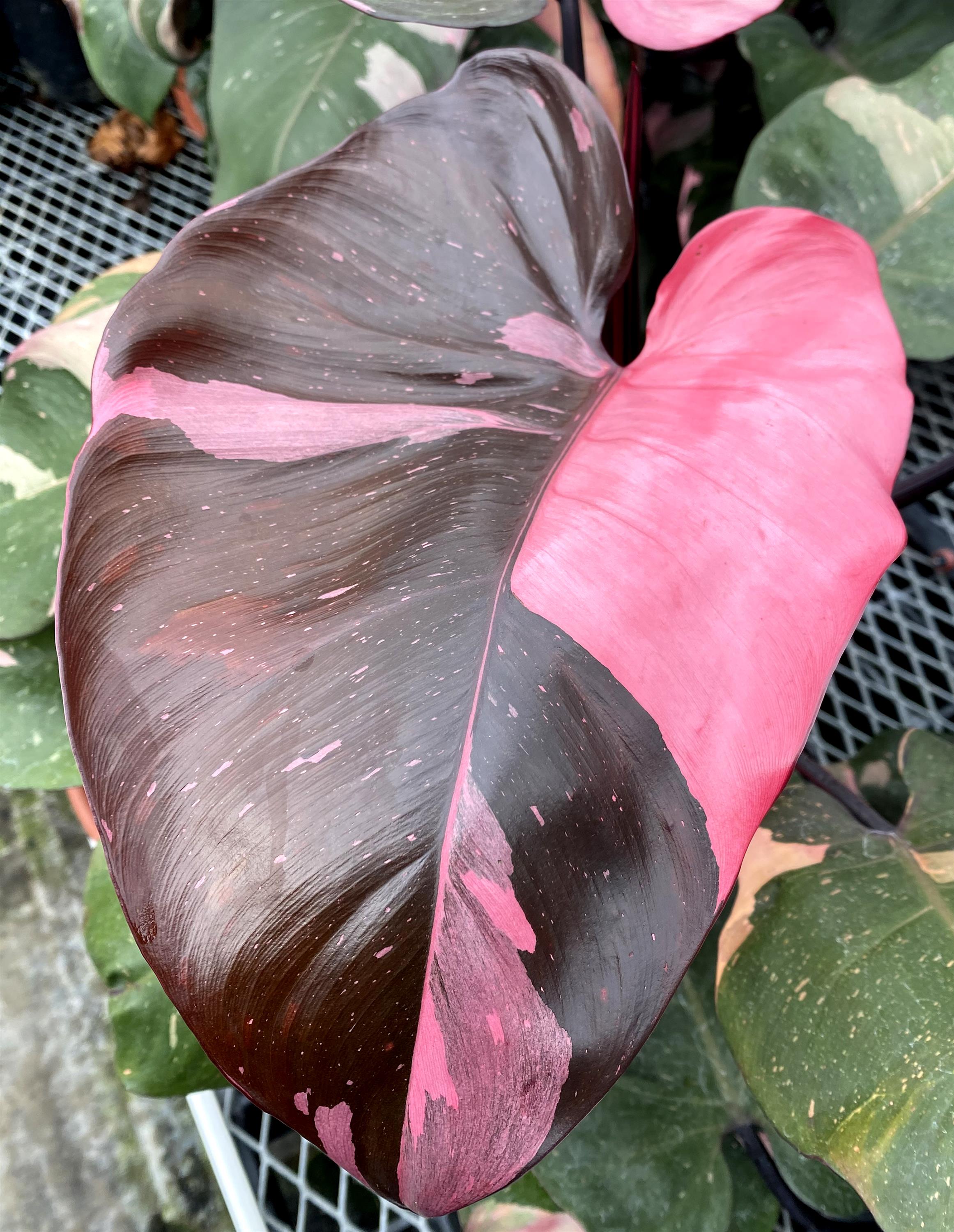 PHILODENDRON 'Pink Princess'. 2-4' tall, 1-2' spread, bright; indirect light. Dramatic, heart-shaped leaves marked with striking pink variegation alongside deep green and sometimes burgundy tones. Blooming is rare in cultivation, but mature plants may occasionally produce small, pale spathes typical of philodendrons. Develops a climbing or upright habit when given support. Too little light may reduce the pink coloring, while too much direct sun can cause leaf burn. Typically grown indoors in cooler regions and prefers warm temperatures, moderate to high humidity, and well-draining soil kept lightly moist. Zones 10-12. Potted in 3" pot.