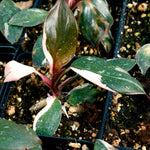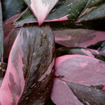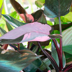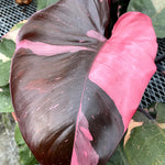 PHILODENDRON 'Pink Princess'. 2-4' tall, 1-2' spread, bright; indirect light. Dramatic, heart-shaped leaves marked with striking pink variegation alongside deep green and sometimes burgundy tones. Blooming is rare in cultivation, but mature plants may occasionally produce small, pale spathes typical of philodendrons. Develops a climbing or upright habit when given support. Too little light may reduce the pink coloring, while too much direct sun can cause leaf burn. Typically grown indoors in cooler regions and prefers warm temperatures, moderate to high humidity, and well-draining soil kept lightly moist. Zones 10-12. Potted in 3" pot.