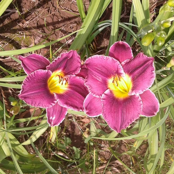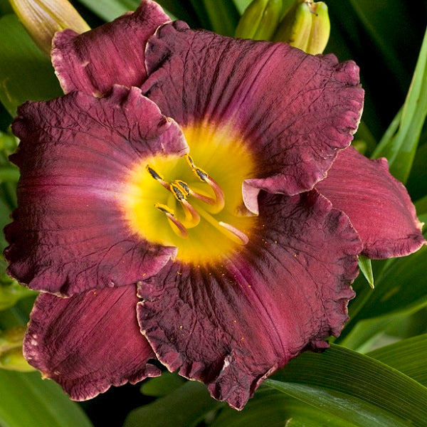 (Mercer-R.) T 30" EM EV Re 6" bloom. The rich, dark reddish purple flower color is sunfast with a wide and round form. The petals have a discreet cream edge and are diamond dusted, giving them a lovely sheen in the sunny landscape. Well-grown clumps can have as high as 70 buds. Full Sun. Attracts butterflies and is bee friendly. Zones 3-9. 2/3 fan division, bareroot.