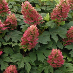 Bushes Ruby Slippers Oakleaf Hydrangea - HYDRANGEA q. 'Ruby Slippers'. 3 ½' tall, 4-5' spread, full sun-part shade, midsummer-early fall bloom. Robust cone-shaped panicles open white, quickly turning pink before maturing to ruby red. Dark green foliage turns a brilliant shade of mahogany red in the fall. Blooms on old wood. Deer and rabbit resisitant. Zones 5-9. Potted in 1 quart pot.
