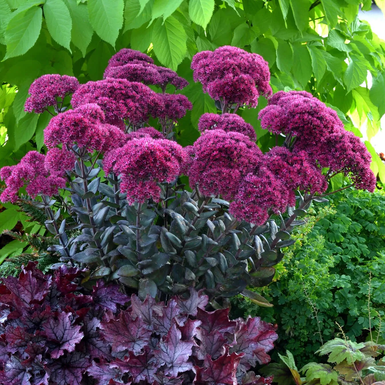 SEDUM x i. 'Thunderhead' PP24693. 27-30" tall, 24" spread, full sun, late summer-early fall bloom. Huge, deep rose-colored flower heads resemble summer thunderclouds. Stout, upright stems and handsome grey-green foliage provides the perfect backdrop for the long-lasting blooms. Attracts butterflies. Rabbit resistant. Zones 4-9. Potted in 3" pot.